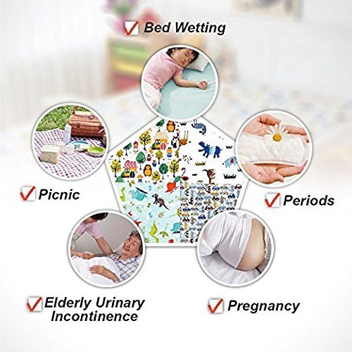 - 長所:高防水性(一晩中安心)、高耐久性(洗濯や日焼けに強い)、高通気性(通気 性・防水性に優れたナノファイバーを使用)、高吸水性(図柄層)、高防滑性(プレー ン色層はベッドシーツ、パズルマット、畳などの防滑に使える)、赤ちゃんのオムツ替 えにも(持ち運びに便利)