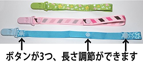 - クリップは樹脂製、ホックはプラスチック製で安心安全です。おしゃぶりはもちろん、歯固め、おもちゃ、帽子などにも使えます