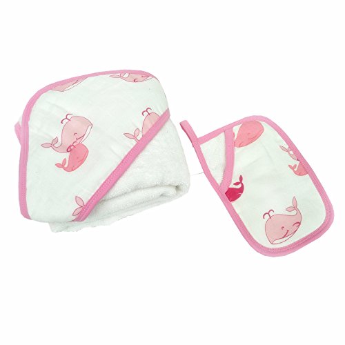 LAT(リー·アンド·タウン)フード付けタオルとウォッシュクロスセット Muslin Cotton Bath Hooded Towel & washcloth set (入浴手袋付き・ピンク魚)