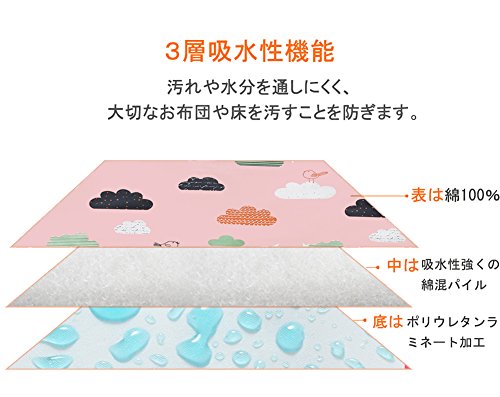 - 【しっかり防水対策】3層吸水性機能、中は吸水性強くの綿混パイル、底はポリウレタンラミネート防水加工なので、水分が下まで浸透しません。おむつ替え以外でも、床・テーブル・お洋服などを汚したくないというシーンでお使い頂けます。