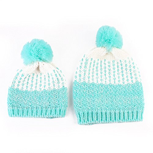Ligangam 親子ニット帽子 コットン キッズ/大人用 2点セット シンプル 暖かい 毛玉付き 秋冬 防寒 スタイリッシュ 毛糸 5色入り (ブルー)