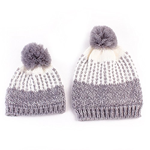 Ligangam 親子ニット帽子 コットン キッズ/大人用 2点セット シンプル 暖かい 毛玉付き 秋冬 防寒 スタイリッシュ 毛糸 5色入り (グレー)