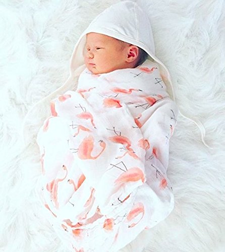 とてもやわらかくてかわいいフラミンゴのデザインの竹繊維レーヨン100%おくるみです。おくるみのみではなく、ブランケット、授乳ケープなど様々な用途に使えます。また吸収性や通気性に優れておりよだれふきなどタオルとしても最適です。