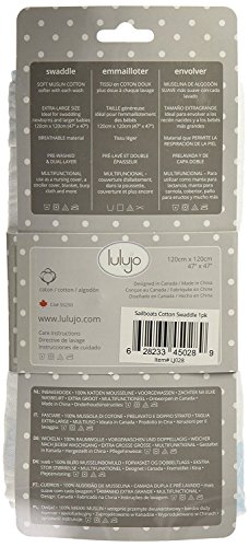 Pattern:Sail Boat 47 x 47-Inch muslin cotton swaddling blanket is white with a cute and colorful blue sail boat print. Soft and breathable. Use to swaddle, use as a blanket, a nursing cover, a change mat, stroller cover, and more. Pre-washed and dual layer. 100% cotton (120cm x 120cm). Lulujo' s dedicated and experienced design team is committed to creating durable, functional, and environmentally conscious products that safely meet the needs of babies and parents.