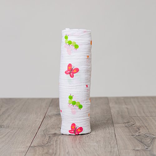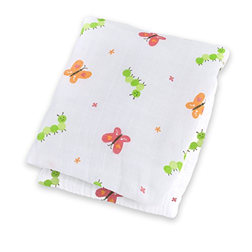 100% Cotton;Pre-washed, dual layer, and softer with each wash;Extra large 47 x 47 inch swaddling blanket;Muslin cotton wrap made with finely woven soft and breathable cloth;White blanket printed with green caterpillars and butterflies featuring hearts on their wings;Babies feel safe and secure while swaddled, can also be used a blanket, nursing cover, stroller cover, and more