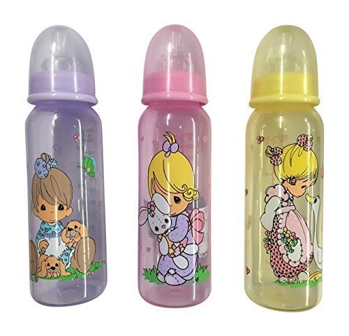 1 package of 3 Precious Moments Feeding Bottles 8oz each;Made from break resistant BPA Free plastic;Graduated in both ounces and ml;Top rack dishwasher safe;includes 3 Nuby medium flow, anti-colic nipples