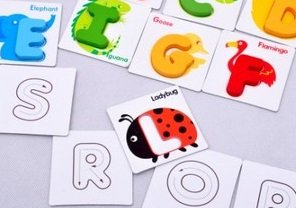 - 木のアルファベットをカードにはめ込んだり、アルファベット単品を並べて遊んだり、遊びながら楽しく英語の勉強。