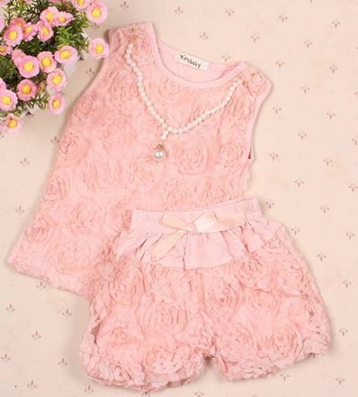 レースパネルがカワイイデザインの女の子のセットアップ。上下が分かれているのでトイレも楽ですね。お出かけの時にはフェイクパールネックレスでおしゃれに。