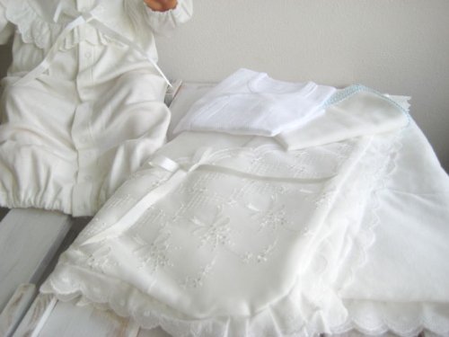春秋物素材 新生児 退院時 お宮参り用 ベビードレス・ベビーアフガン他5点セット シンプルデザイン