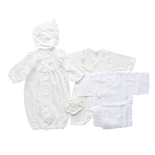 商品は全て 生地・縫製ともに安心安全の日本製。新生児赤ちゃんの退院時やお宮参りにおすすめ!お帽子・ベビードレス・短肌着・コンビ肌着・ベビーソックスの5点セット! ベビードレスの素材は夏物の天竺素材です。
