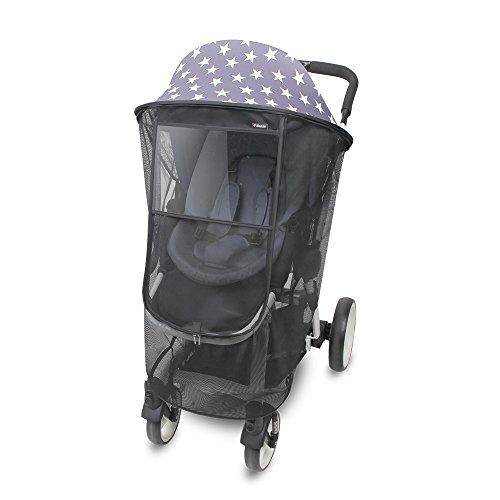 春から秋まで気になる強い紫外線と蚊を始めとした害虫。それらから赤ちゃんを守る最強アイテム!ほとんどのA型、B型のベビーカーに装着できるフリーサイズ。虫よけネットは先に装着するサンシェードにジッパーでさっと装着するだけの魔法のような製品です。サンシェードは単品使いも可能で、チャイルドシートにも装着できます。かぶせるだえの虫よけネットだと風に飛ばされたり、赤ちゃんの視界が遮られ、ぐずってしまうことも多いですが、この製品なら足元まですっぽり覆ってくれ、風でも飛ばされません。また赤ちゃんの視界は無色透明、紫外線99%カットの視力保護窓付きだから虫よけネットをしていないのと同じ視界を実現してくれます。公園遊びや海や川遊び、バーベキューなど、屋外でもレジャーならこのアイテムがあれば完璧です。