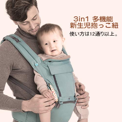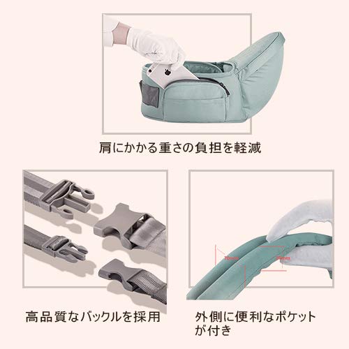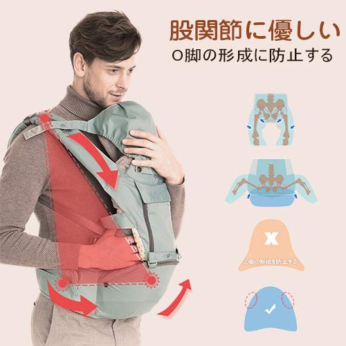 - 【人間工学設計のベビーキャリアー】調整可能の肩ストラップとウエストベルトが赤ちゃんの重さを分散し、負担を軽減してくれます。数時間抱っこ紐として使用しても、子供の下腹部を圧迫することがありません、肩ストラップが太く、肩と腰で支える構造になっているので、肩こりや腰痛持ちの人には特におすすめです。そして、ママが赤ちゃんを手で抱くことで背骨が歪むになるということが防止できます。クッション部は骨格に合わせ、赤ちゃんの股関節にくる部分を狭めながらも理想のMをキープすることができるようにして、O脚の形成も防止できます。