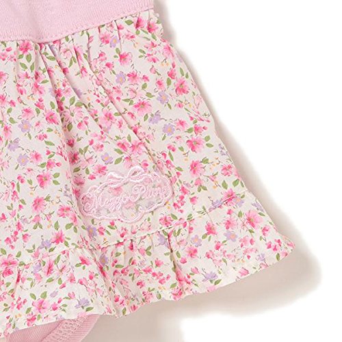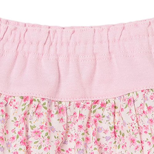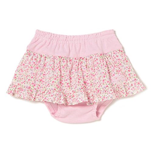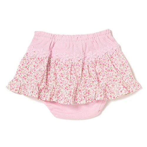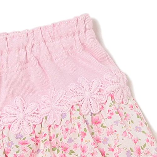 ■花柄のギャザーフレアをプラスして、スカート風に仕上げたカバーパンツです。ふんわりと広がるシルエットが女の子らしさ満点。 ブランドをかわいく印象づける、ロゴ入りのモチーフレースもポイントです。ソフトな編地をメインに用いて、はき心地良く仕上げました。