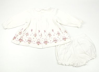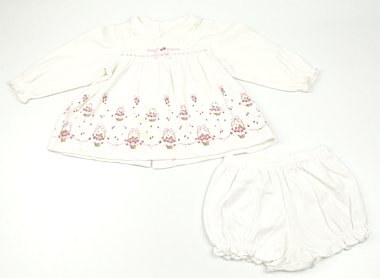 暖かみのある厚手カットソー上下。全体に毛羽立ちがあり、前中心と袖に黄色っぽい汚れが複数あります。ボトムの脇にも黄ばみがありますが、普段着としていかがでしょうか。ピンクのイチゴのバスケット柄がキュートなmezzo pianoらしいデザインです。