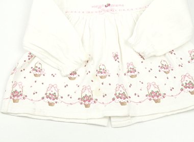 - 暖かみのある厚手カットソー上下。全体に毛羽立ちがあり、前中心と袖に黄色っぽい汚れが複数あります。ボトムの脇にも黄ばみがありますが、普段着としていかがでしょうか。ピンクのイチゴのバスケット柄がキュートなmezzo pianoらしいデザインです。