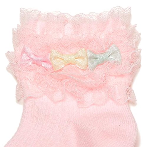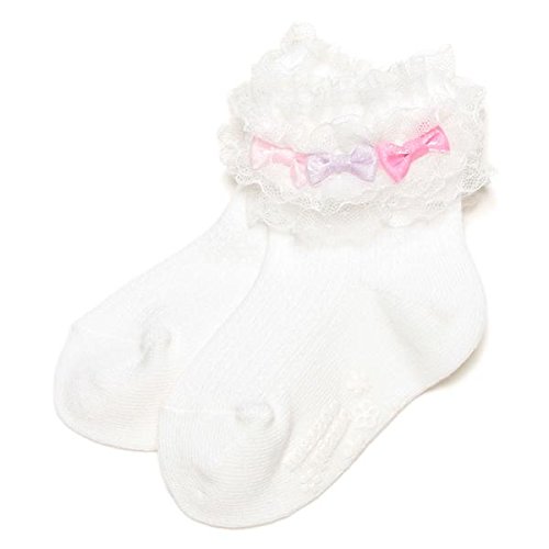 ■ふわふわなレースフリルと、カラフルなリボンモチーフでSWEETに飾ったソックスです。足裏部分にお花やロゴのすべり止めプリントをほどこして、見えない部分もキュートに仕上げたアイテム。 コーディネートを女の子らしく演出します。