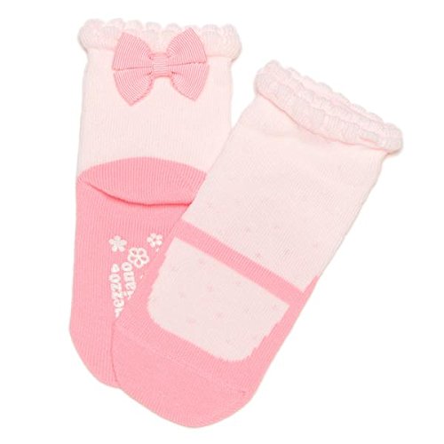 ■ストラップシューズを合わせているような、配色デザインに遊び心が光るソックスです。バックのリボン飾りは後ろ姿をキュートに演出。 モコモコとしたはき口や、さりげないドット柄もガーリームードを盛り上げます。足裏にすべり止めプリントつき。