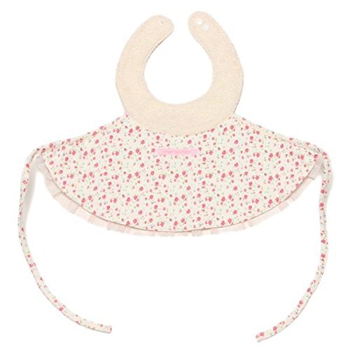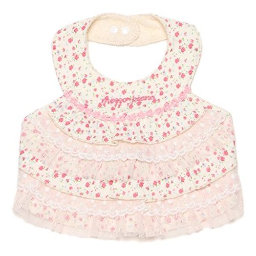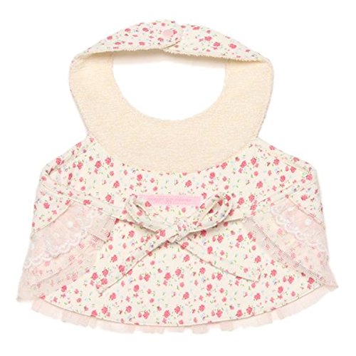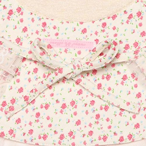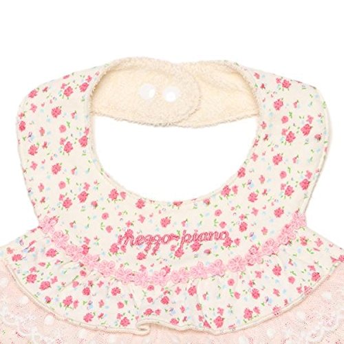■小花柄を全体にあしらった可愛らしいスタイです。フラワーのテープやレース、チュールのティアードでより女の子らしくデザインしました。フロントにはロゴ刺しゅうをオン。 首周りはスナップボタンで2段階まで調整が可能。後で紐を結んで固定できるタイプです。お祝いにもピッタリなアイテム。