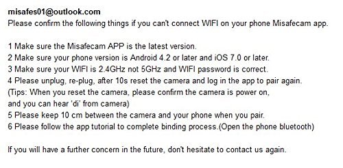 - Please download the app 'Misafecam'. You can receive alert emails on your phone app automatically in exceptional situations. keep 10 cm between the camera and your phone when you pair.