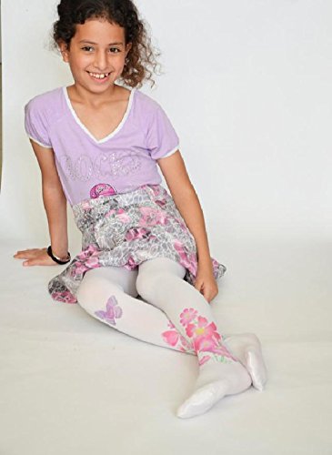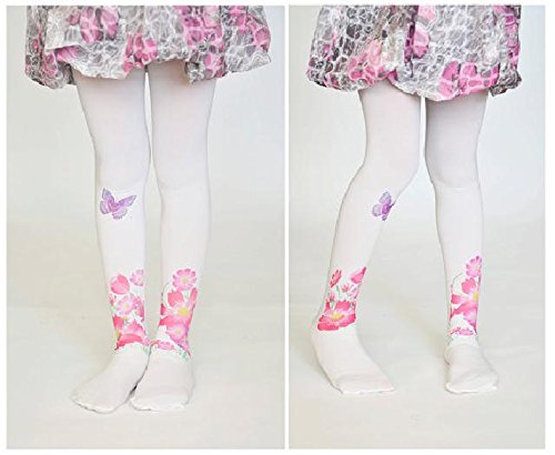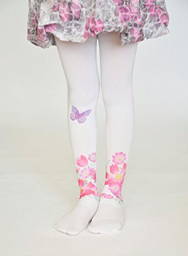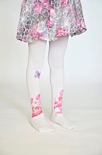 ☆子ども用デザインタイツ☆ホワイト&ピンクの花と蝶40デニール