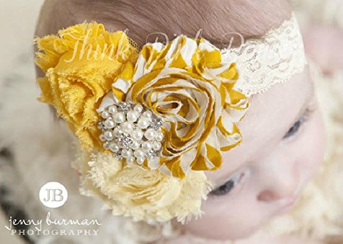 ☆トリプルシャビーローズとラインストーンのヘアバンド☆イエロー、アイボリー&シェブロンストライプ