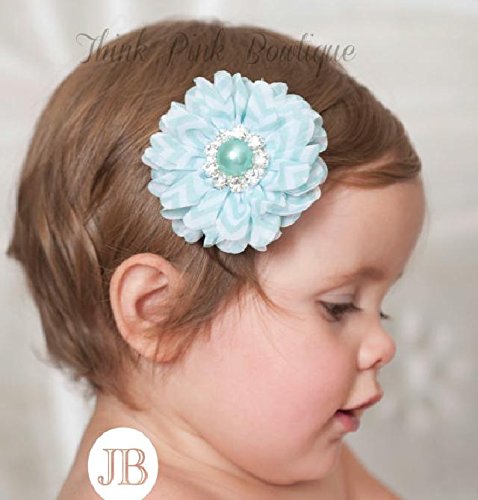 ☆個性的なシェブロンストライプシフォンフラワーとラインストーンのヘアクリップ☆ライトブルー