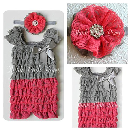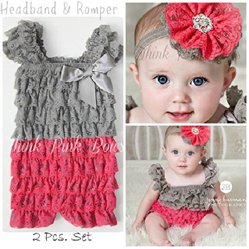 ロンパース&ヴィンテージヘッドドレス☆ホットピンク&グレー newborn-4T(50-110)【2点セット】