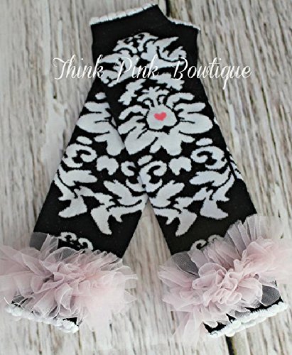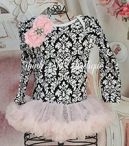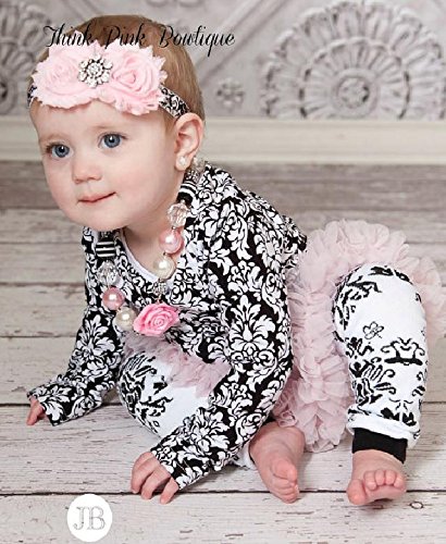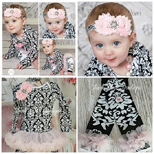 ベビーチュチュ付きロンパース、レッグウォーマー&ヘアバンド【3点セット】ピンク&ブラックダマスク柄☆0才~3才!