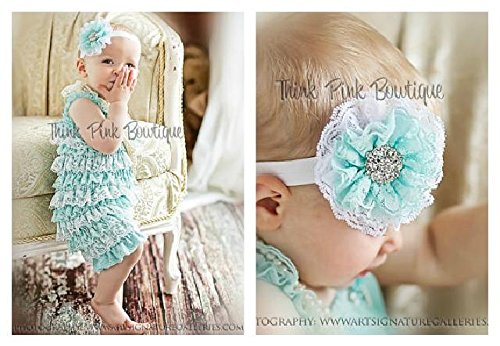 ロンパース&ヴィンテージヘッドドレス☆ホワイト&アクアブルー newborn-4T(50-110)【2点セット】