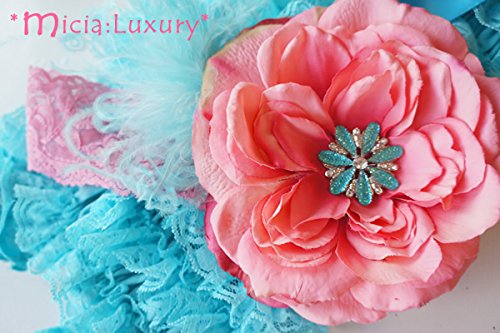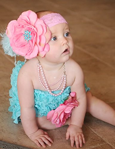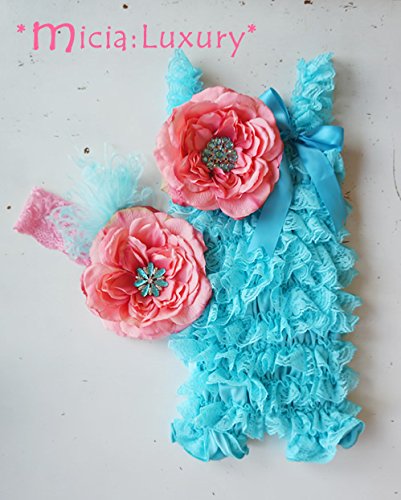 美ロンパース&フラワーファーレースヘッドドレス☆アクアカラー他のベビーと一歩差がつくオシャレ上級セットコーデ☆海外デザインならではの美しい色合いがこだわり派のママに選ばれています!