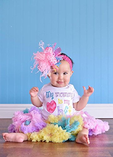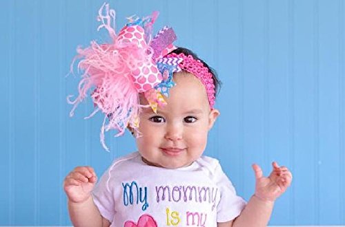 ベビーピンクカラーのふんわりダチョウファーを中心に、ピンク、イエロー、ターコイズ、パープルのドット柄、シェブロン柄、ラメ入りとシフォンリボンをふんだんに使ったヘアバンド。ベビーピンクにパステルカラーがふわふわのわたあめみたいでとってもキュートです!!
