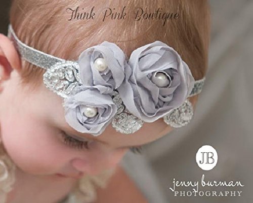 シフォンフラワーの中心に小さいパール、周りにはシルバーリーフを飾りました☆シルバーのバンドも素敵! シンプルでエレガントなベビーヘアバンド