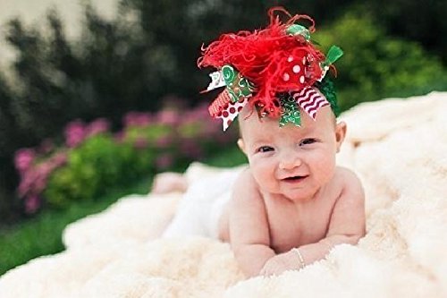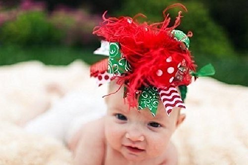 レッドカラーのふわふわダチョウファーを中心に、レッド&ホワイトのドット柄、なみなみ柄とグリーンのシフォンリボン、グリーンのツタ柄のリボンをふんだんに使ったヘアバンド。レッド&グリーンが冬にピッタリの仕上がりです。