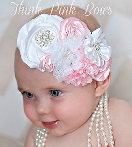 素材の違うお花をまとめた、シンプルでエレガントなベビーヘアバンド それぞれのセンターに飾られたラインストーンが存在感抜群です!