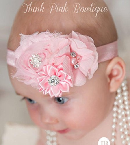 素材の違うお花をまとめた、シンプルでエレガントなベビーヘアバンド それぞれのセンターに飾られたラインストーンが存在感抜群です!
