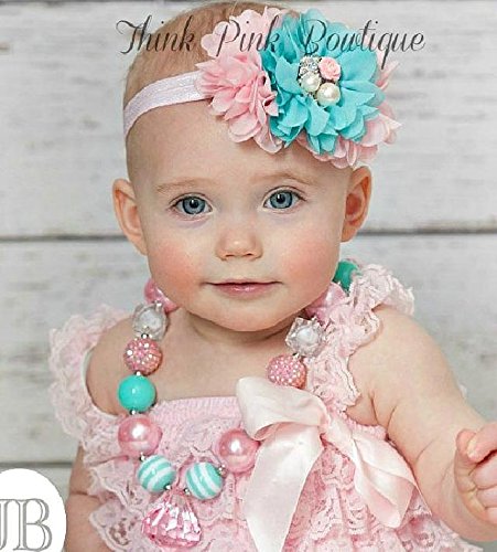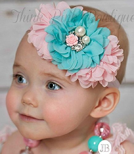 ☆きれい色オーガンザローズとラインストーンのヘアバンド☆ピンク&アクアブルー