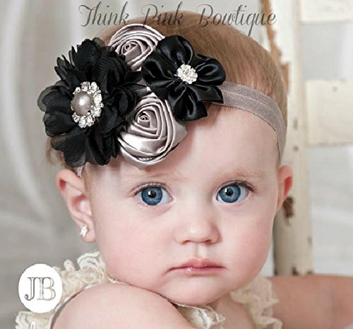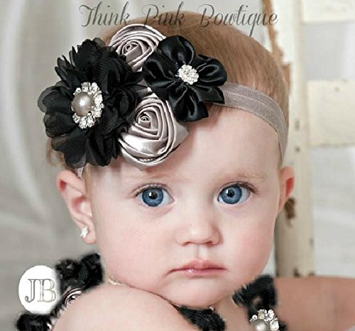 素材の違うお花をまとめた、シンプルでエレガントなベビーヘアバンド それぞれのセンターに飾られたラインストーンが存在感抜群です!