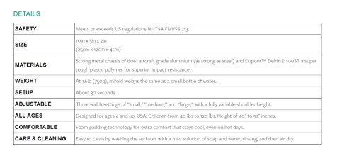 4歳から12歳までの年齢に対応しており、商品は安全基準のバージョンによってアメリカの安全基準「FMVSS 213」とヨーロッパの安全基準「ECE R44/04」「ECE R129」があり、ECE R44の承認を得ているものは日本でも使用可能。