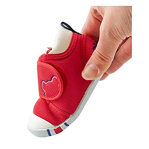 よちよち あんよを始めた頃からの 赤ちゃんの正しい歩行を しっかりとサポートする ミキハウス ( mikiHOUSE ) ベビーシューズです。つま先が少しあがっているので 歩き始めの赤ちゃんも 歩きやすく ファーストシューズとして たっちやあんよの練習に お使いいただけます。面ファスナーで甲ベルトが開いて 調節できるので 履かせやすく 甲高の赤ちゃんの足にもフィットします。底が全面ラバーなので 室内だけでなく お外歩きにも 使っていただけます。日本製ですので 御出産のお祝いにもおすすめです。