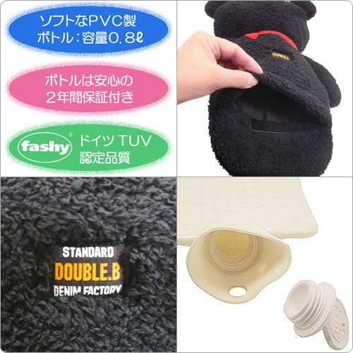 mikihouse Double_B(ミキハウスダブルB)縫いぐるみカバー付きfashy社製湯たんぽ(2年間保証付き) ---,黒(05)