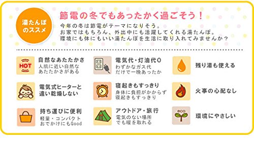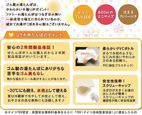 環境先進国ドイツ・ファシー社とのコラボ湯たんぽです★ 英国安全規格BS基準をもとに「TUV(ドイツ技術監査協会)」に適合したものでありその品質と安全性はヨーロッパにおいて高い評価を受けています。 ソフトなPVC製で継ぎ目のない一体構造のボトル。 スクリューキャップでしっかり密閉でき、注ぎ口が大きくお湯が入れやすいことも人気の理由です。 ボトルは安心の2年間保証つきです。 おやすみ前にお布団に入れておけばホッカホカ♪ 電気代が節約できてエコロジー!! だっこしやすいよう縫いぐるみタイプの可愛いカバー付きです。 暖かいこと!地球にやさしいこと!環境の面からも、健康の面からも、湯たんぽ生活はおすすめです。 ※通常のゆたんぽは、お湯のみの使用ですが、当製品は水を入れ、冷蔵庫で冷やすことにより、水枕としても使用できるスグレ物です。 TUV(ドイツ技術監査協会)に合格し、その品質と安全性はヨーロッパにおいて高い評価を受けています。 ●湯たんぽサイズ:W15×H25cm(注ぎ口5.5cm含む) ●容量:800ml(スモールタイプ) ●耐熱温度:本体90度、キャップ90度 ●耐冷温度:本体-20度、キャップ-20度 ●カバーサイズ(ぬいぐるみ):W33×D9×H53cm 【品質保証書とアフターサービスにつきまして】 ・弊社でお買い求め頂いた湯たんぽ本体の保証期間はお買い上げ時からの2年間です。 ・2年を経過したボトルは、経年劣化が生じる場合がありますので、ボトルの状況を見ながら5年を目安に新しいボトルへの買い換えをお勧めします。