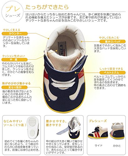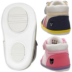 ダブルBのプレーンなプレシューズです★ あんよを始める前に、靴に慣れるためのトレーニングシューズとしての役割もあり お家のなかでの、たっちやよちよち歩きの練習に最適です。 本格的なスポーツシューズに似せたデザインで、トリコロールカラーとパステルカラーの2色で登場♪♪ デリケートな赤ちゃんの足に負担をかけないよう、やわらかな素材を使用しています。 靴底には立体的な滑り止めつき。 甲ベルトは大きく開き、靴ゴムで伸縮し、履かせやすい仕様になっています。 赤ちゃんの足にやさしく、あんよを快適に始められる機能を備えたプレシューズ! あんよの記念にもオススメです。 かかとにワンポイント刺繍付き★ 生まれて初めてふれるシューズ!ダブルBのプレシューズで。。。 ★こちらの商品にはブラックベア(ビーくん)がプリントされた箱がついています。
