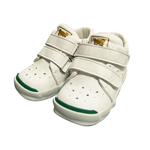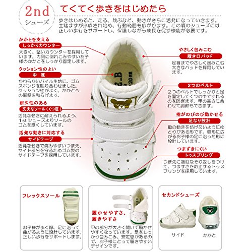 走り回れるようになったお子様におすすめのセカンドベビーシューズです。 このベロは普通の靴より分厚いので、足入れをする際に靴の中に巻き込まれにくくなってます。 また、普通の靴はマジックテープ部分を外すと元に戻ってしまうので、 お子さまが足入れする際マジックテープ部分を手で押さえて足入れをしなくてはいけません。 しかしこのシューズはマジックテープ部分の付け根に金具が付いているため戻らないんです☆ そのため、お子様の足入れをスムーズに行って頂くことができます。 その他にも、「しっかりカウンター」によって、お子様のやわらかい足をしっかり支える機能、 踏み返しが容易にでき、正しい位置で屈曲し、歩き易い「フレックスジョイントソール」機能も使用しています。 シンプルなデザインだからどんな服にも合わせやすく、ちょっとしたフォーマルな場にもぴったりです☆ ●フレックスジョイントソール●しっかりカウンター●2E【品質】人口皮革★こちらの商品にはブラックベア(ビーくん)がプリントされた箱がついています。