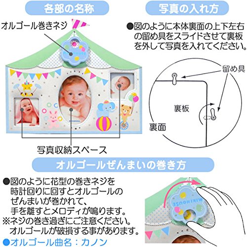 遊園地ふうのとっても可愛いフォトフレームです☆ 巻きネジのオルゴールがついて、心から癒されますね♪ お花型の巻きネジを時計回りに回すと、オルゴールがのぜんまいが巻かれて、手を離すとメロディーが鳴ります。 カノンの曲が優しく響きます。 きらきらとラインストーンがついた豪華なフォトフレームです。 ギフトにもおすすめです。 ●オルゴールの曲名:カノン 【注意】 ネジの巻き過ぎにご注意ください。オルゴールが破損することがあります。 ※安全にお使いいただくためにお取扱い説明書をご確認ください。また説明書はいつでも参照できるように大切に保管してください。 ●本体サイズ:W305×H245×D10mm ●入れられる写真サイズ:W89×H127mm、W70×H76mm、W70×H74mm [素材]ポリエステル、MDF、プラスチック、クリスタルラインストーン [中国製]