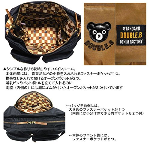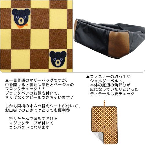 ダブルBから新シリーズのマザーバッグが登場です♪ 上部のファスナー部分にもマチをもうけて、さらに入れ口が大きく開いて中身も確認しやすく、物も出し入れしやすくなっています。 一見普通のマザーバッグですが、中を開けると裏地は茶色とベージュのブロックチェック!! ブラックベアのお顔も付いて、さりげなくアピールできちゃいますよ♪軽くて収納力もタップリ!しかもオムツ替えシート付きが嬉しいですね♪ ショルダーバッグだから、両手も自由につかえてGOOD!マザーバッグを卒業しても、長くお使いいただけるデザインになっています◎ ●サイズ:[バッグ]W35×H27×D13cm,(上部ファスナーマチ)6cm [オムツ替えシート]W64.5×H45cm ●重さ:バッグ:455g,オムツシート:85g