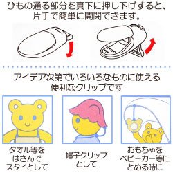可愛いプッチーのマスコットが付いたマルチクリップです☆ クリップにタオルやハンカチをはさむとスタイとしてご利用できます☆ クリップは軽い力で簡単に開閉できます。 大きく開いて、しっかり閉まる! ヒモの長さは調節可能なだけでなく 生地に多少伸縮性があるのでベビーの首元に負担をかけません。 使用方法: スタイとして使うもの(タオルなど)をベビーの胸元において クリップのヒモを首にかけ、胸元でタオルを挟みます。 ●手洗い可能 [生産国]日本