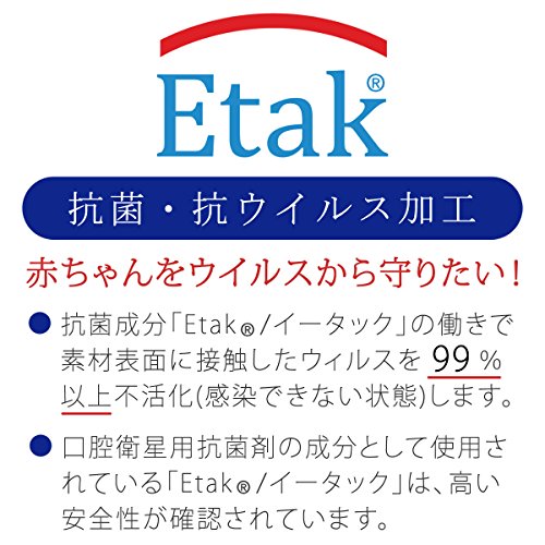 コンビ肌着は保温のための肌着です。短肌着に重ねて使います。 足までスッポリ包んでくれて、お腹をしっかりガードしてくれます。 ●天竺 ~さらっと爽やか~ 春から夏向きの薄手で平編み地。通気性に優れ、サラッと涼しい軽い肌触りが特徴。 ●ポイント1 優れた抗ウイルス性・抗菌性 素材の表面に付着するウイルスや細菌を99%以上感染できない状態にし、その働きを抑えます ●ポイント2 優れた洗濯耐久性 素材の風合いを生かしながら、繰り返し50回洗濯しても高い効果が持続します ●ポイント3 高い安全性 口の中の治療や洗浄に使用される消毒薬がベースなので、赤ちゃんの肌に触れても安全 赤ちゃんのまわりにはウイルスや細菌の危険がいっぱい! 赤ちゃんは抵抗力がなくて感染に弱いので、着るだけで抗菌・抗ウイルス効果が期待できる 安心安全加工「ピュアベール」を施した肌着ならママも安心ですね。 肌触りがよく、保温性と発汗性に優れ、刺激の少ない肌着で守ってあげたいですね。 ※「安心安全加工 ピュアベール」とは… ミキハウスがクラボウと共同開発した新加工「ピュアベール」 うがい薬の成分をベースに開発された固定化抗菌成分「Etak(イータック)」を肌着の生地にしっかりと浸透固着させ、肌着の素材表面に付着したウイルスや細菌を99%以上感染できない状態にし、その働きを抑えます。 ※「Etak?(イータック)」とは… 固定化抗菌成分。 口腔衛生用抗菌剤に使用され、優れた抗菌性と安全性が確認されています。 [品質]綿100%[日本製]