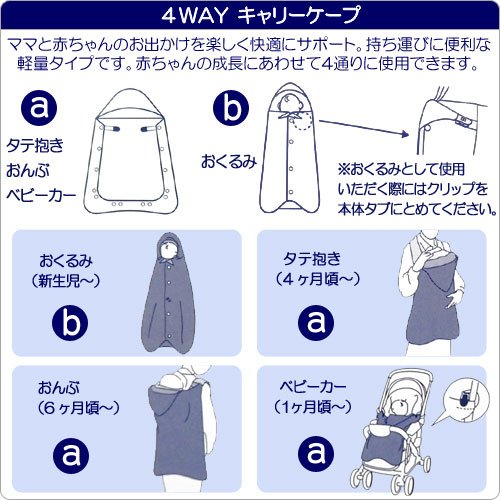 お出かけを楽しく快適にサポートする4WAYキャリーケープです。 無地のナイロン面と、星柄のフリース面とリバーシブルに使えてとっても便利です。 持ち運びに便利な軽量タイプ! ふわふわで心地よい肌触りのフリースで、とってもあったか◎ お昼寝の掛け布や、チャイルドシート装着時などにも、ご使用いただけます。 赤ちゃんの成長にあわせて4通りに使用できます。 ・おくるみとして(新生児~) ・タテ抱き(4ヶ月頃~)…ママの手を入れられる前面ポケット付き ・おんぶ(6ヶ月頃~)…ベビーキャリーに装着してからご使用ください。 ・ベビーカー(1ヶ月頃~)…ベビーカーの両側にクリップをとめます。 [素材](表側)ナイロンタフタ (裏側)フリースプリント [品質](表側)ナイロン100% [生産国]中国