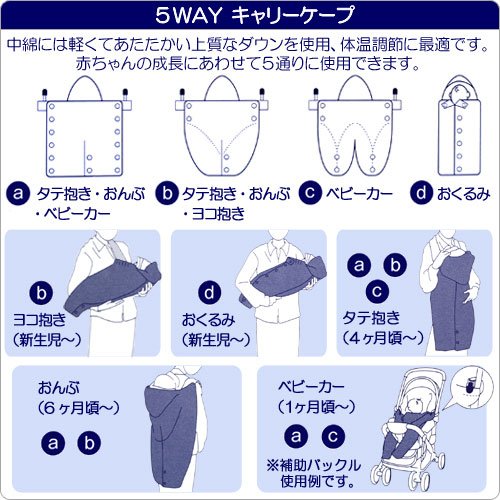 お出かけを楽しく快適にサポートする5WAYキャリーケープです。 中綿に軽くてあたたかい上質なダウンを使用し、体温調節に最適です。 持ち運びに便利な軽量タイプ! 裏地がふわふわで心地よい肌触りのフリースで、とってもあったか◎ ギフトにも最適です☆ 赤ちゃんの成長にあわせて5通りに使用できます。 ・ヨコ抱き(新生児~) ・おくるみ(新生児~) ・タテ抱き(4ヶ月頃~) ・おんぶ(6ヶ月頃~)…ベビーキャリーに装着してからご使用ください。 ・ベビーカー(1ヶ月頃~) [素材](表地)〈紺〉先染格子〈ベージュ・ブルー〉ナイロンタフタ (裏地)フリース [品質](表地)〈紺〉ポリエステル100%〈ベージュ・ブルー〉ナイロン100% (裏地)ポリエステル100% (中綿)ダウン80%、フェザー20% [生産国]中国