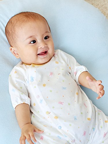 前スナップボタンは、脇側についているので、うつぶせになってもお腹が痛くなくて安心です。股下までスナップボタンで全開するので、お着替えやおむつ替えもラクラク便利です。